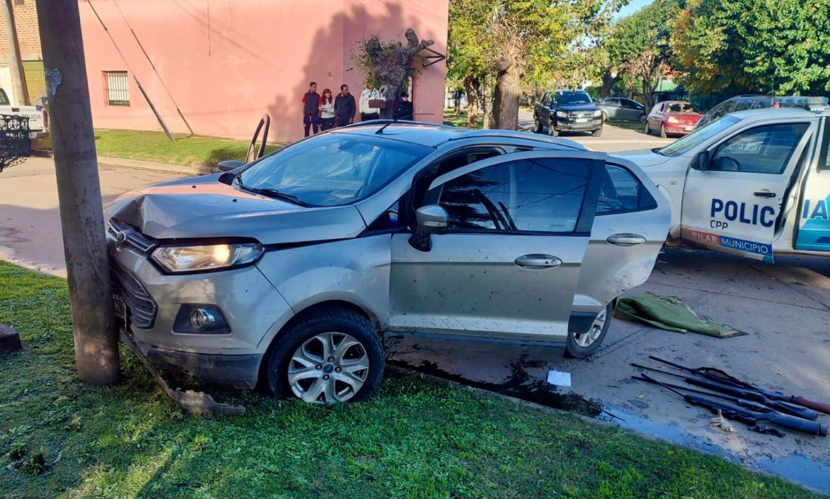 La Policía de Pilar recibió una denuncia por una entradera, en la cual los ladrones hirieron con un arma de fuego al propietario. Luego del robo, los delincuentes se dieron a la fuga en una camioneta Ford Ecosport, propiedad de la víctima. A partir de ese momento, se inició un operativo cerrojo a traves del anillo de seguridad, que dio lugar a una persecución que culminó cuando los delincuentes fueron interceptados y terminaran chocando contra un árbol.