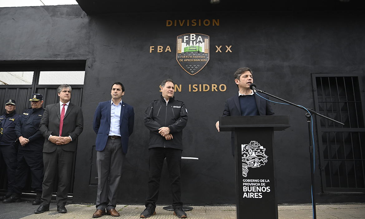 El gobernador de la provincia de Buenos Aires, Axel Kicillof, encabezó la inauguración de las nuevas instalaciones de la Fuerza Barrial de Aproximación (FBA) en San Isidro y puso en funcionamiento 16 patrulleros destinados a comisarías del distrito. Fue en la localidad de Beccar junto al ministro de Seguridad, Javier Alonso, y el intendente local, Ramón Lanús.