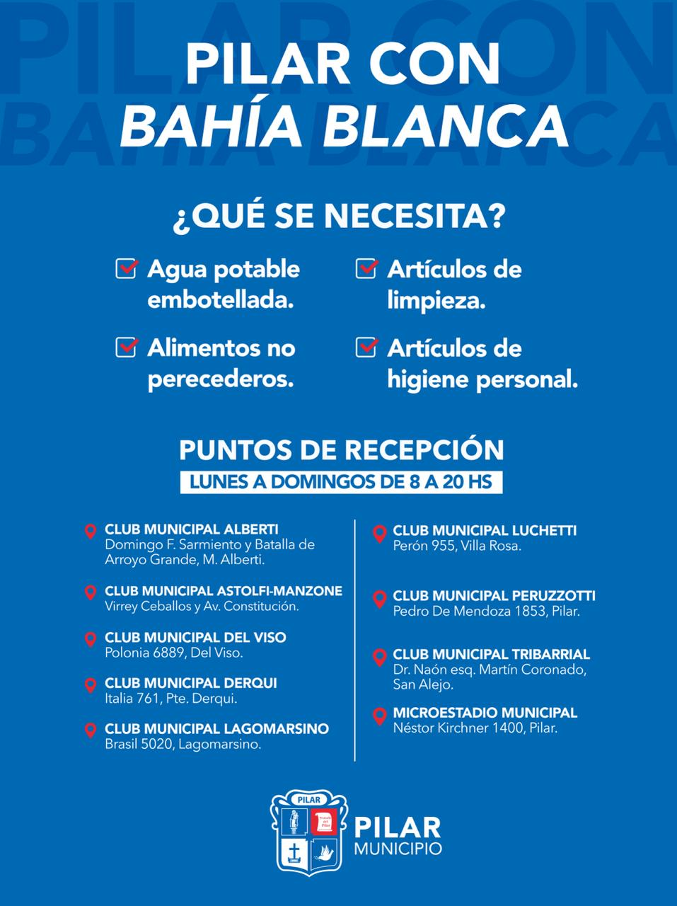 El Municipio estará recibiendo donaciones de agua potable embotellada, alimentos no perecederos, artículos de limpieza y artículos de higiene personal; para enviar a las familias afectadas por el temporal en Bahía Blanca.